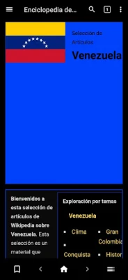 Bienvenidos a esta selección de artículos de Wikipedia sobre Venezuela. Esta selección es un material que puede ser distribuido libremente, de manera gratuita. Dirigida especialmente a estudiantes de Venezuela. Posee cerca de 10.000 artículos y tiene aproximadamente el volumen de 30 tomos de la enciclopedia británica.