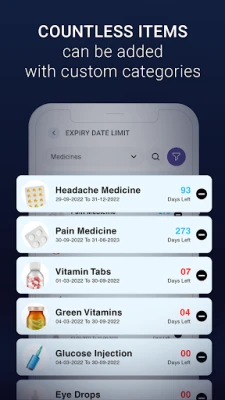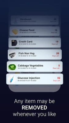 - Display the list of food items or any items sorted by item name or by expiry date. - Get list of expire soon and expired items. - Search / sort items using name & expiry date. - Add new / custom inventory category. - Removed any item anytime. - Get notification when item gets expired or about ot get expired. - Notify on selected reminder date/time.
