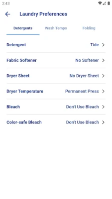 • Your pickup days • Detergents (familiar brands including eco-friendly, hypoallergenic and fragrance free) • Fabric softeners • Wash temps • Dryer Sheets • Dryer temps • Folding preferences • Notifications types and frequency